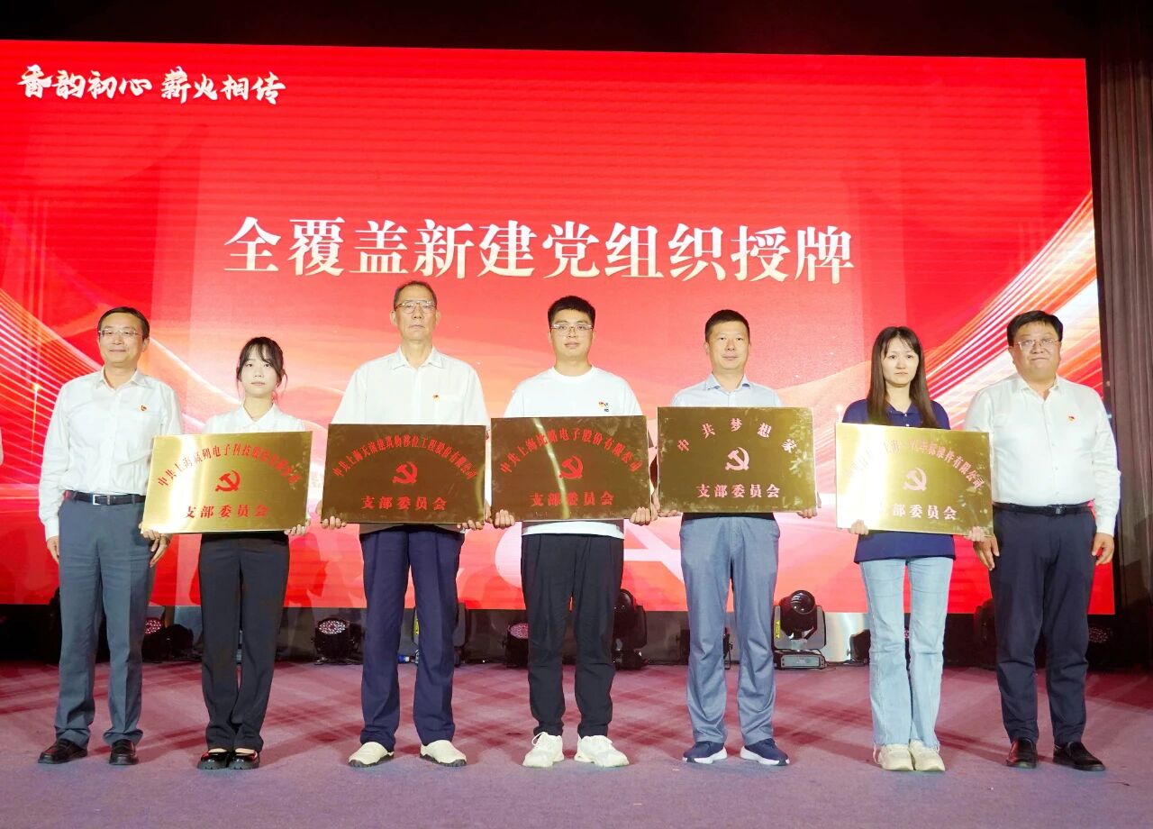 6 月 27 日下午,在香花桥街道举行的以“香韵初心・薪火相传”为 主题的庆祝中国共产党成立 104 周年情景党课—新建重点企业党组 织授牌仪式环节。青浦区区委常委、组织部部长李方明,街道党工 委副书记、办事处主任侯廷永为我司及其他四家重点企业新成立党支部授牌,党支部书记、总经理蓝戊己上台领牌。入党积极分子黄军、束学智、高巍及公司党员梁宝文、李特、郑志远、韩树伟共同见证了这一激动人心的时刻。
