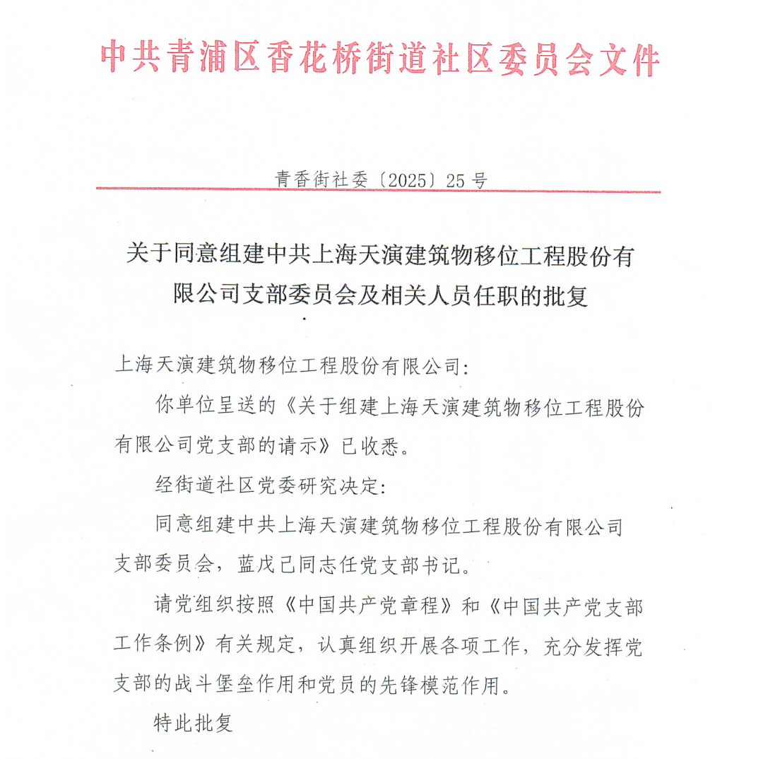 在“七·一”建党节暨中国共产党成立 104 周年之际,上海天演迎来了重要的历史时刻。2025年6月25日,中共上海天演建筑物移位工程股份有限公司支部委员会正式成立,并在 2025年6 月 27 日香花桥街道党工委、香花桥街道办主办的“香韵初心,薪火相传”主题活动中举行了隆重的授牌仪式。这标志着公司在党组织建设方面迈出了坚实的一步,开启了红色发展的新征程。