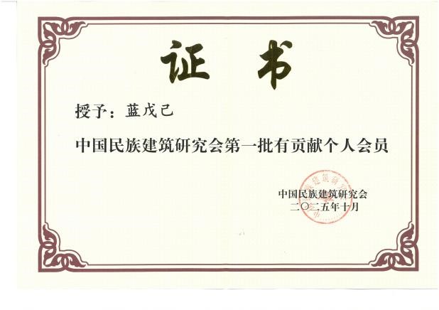 上海天演建筑物移位工程股份有限公司创始人蓝戊己,荣获“中国民族建筑研究会第一批有贡献的个人会员”称号,本人上台领奖(左七)及获奖证书