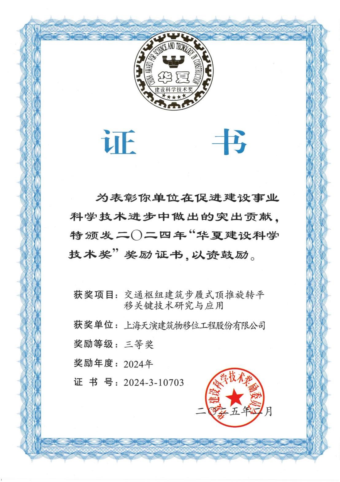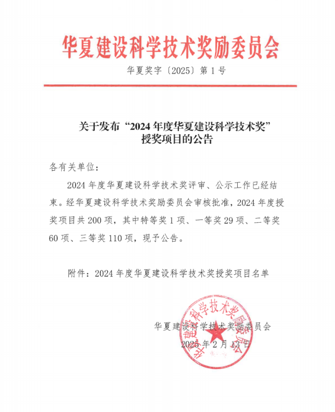 据住房和城乡建设部科技与产业化发展中心官网消息,2月13日,华夏建设科学技术奖励委员会公布2024年度华夏建设科学技术奖授奖项目名单。我公司参与完成的“交通枢纽建筑步履顶推旋转平移关键技术研究与应用”项目荣获2024年“华夏建设科学技术奖”三等奖。这也是我公司第四次荣获华夏建设科学技术奖。